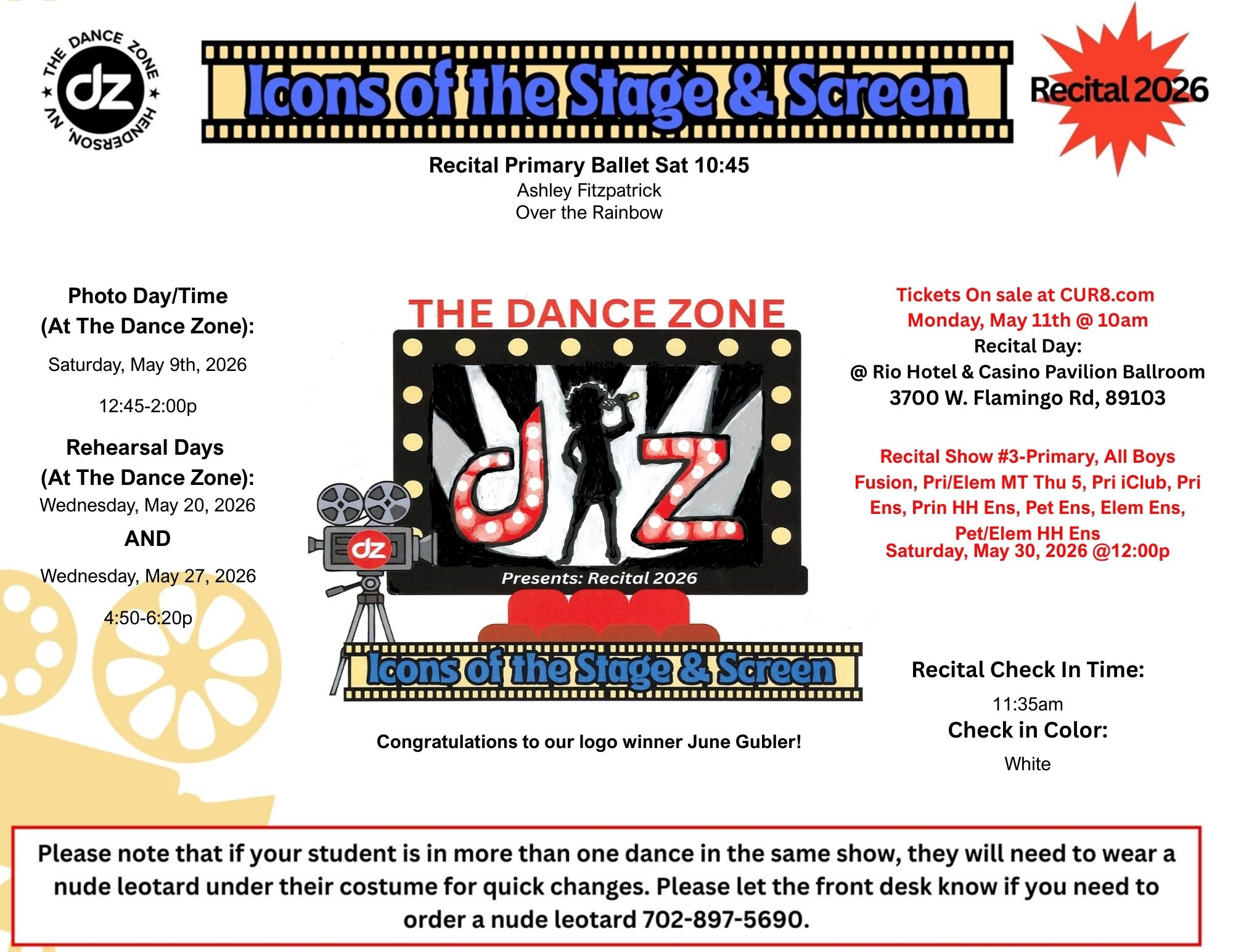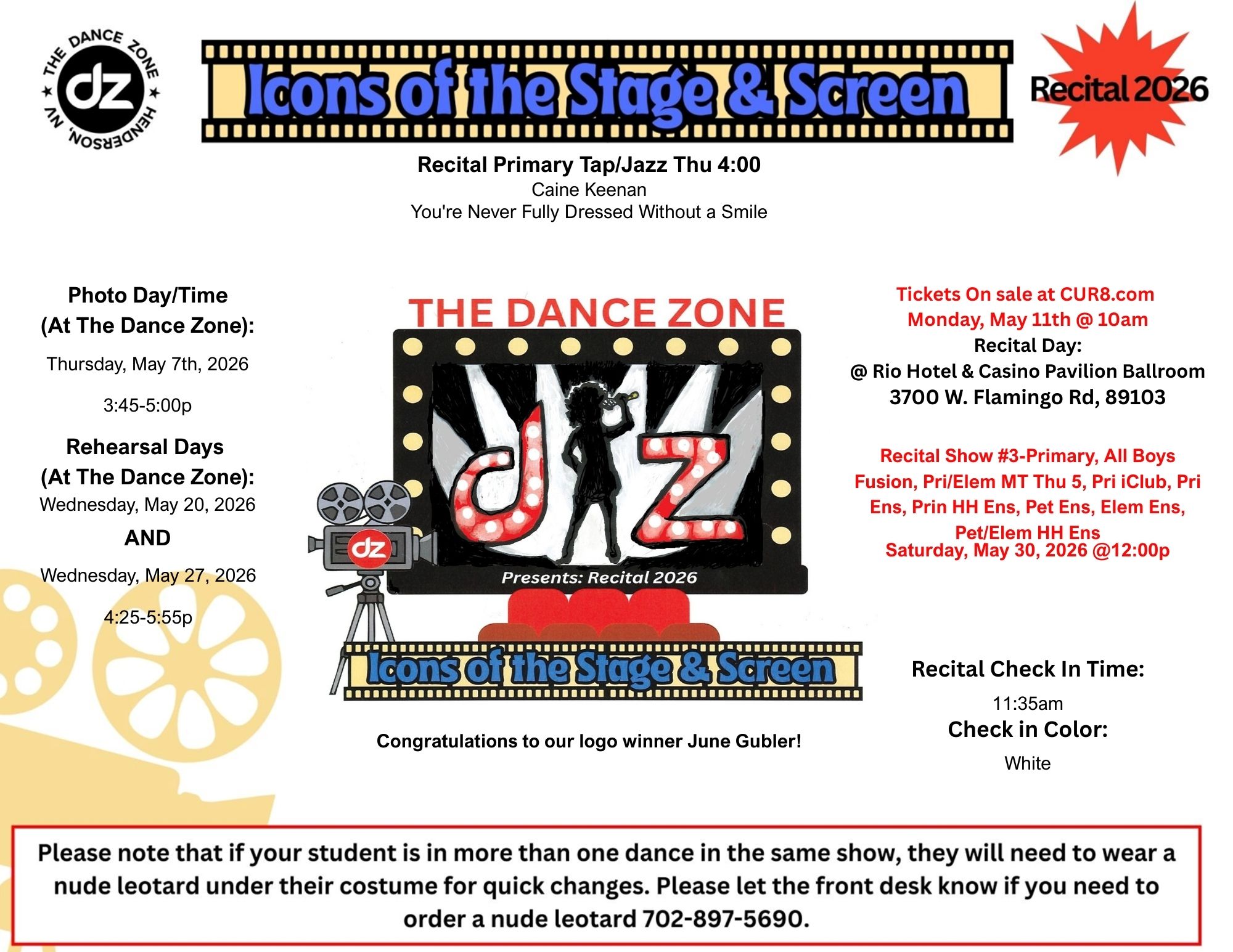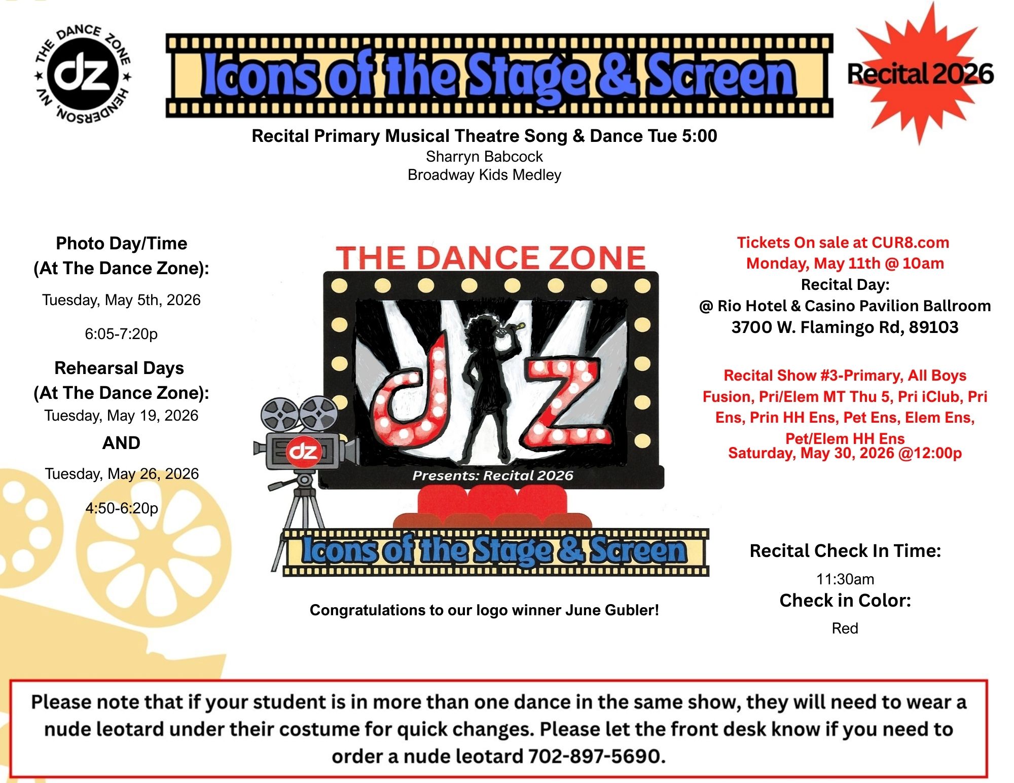 Show #3: Primary Classes, ALL Boys Fusion, Primary/Elementary Musical Theater Song & Dance Thu 5p Primary Club, Primary Ensemble, Primary Hip Hop Ensemble, Petite Ensemble, Elementary Ensemble, Pet/Elem Hip Hop Ensemble: Saturday, May 30th @ 12:00pm