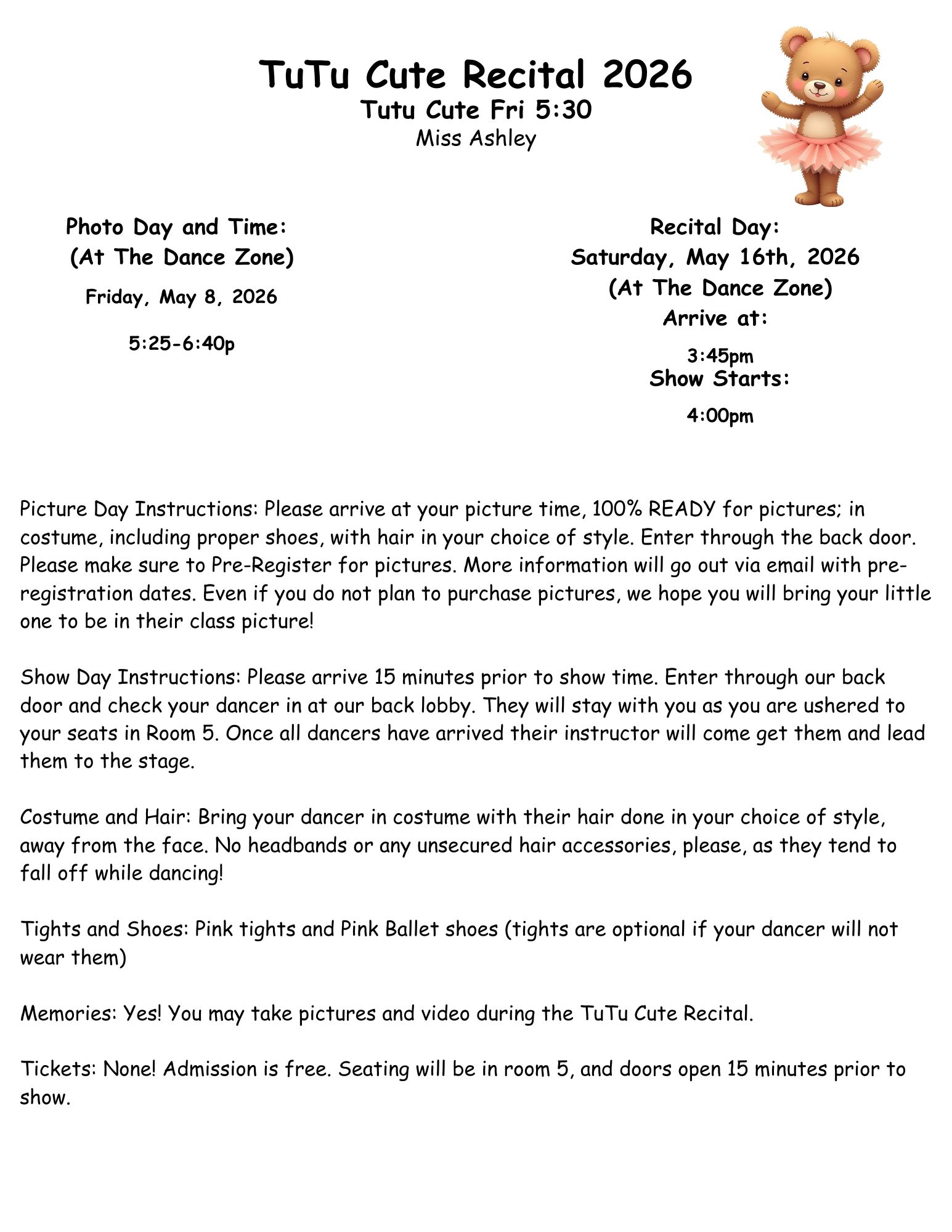 Recital Primary Ballet Sat 10:45- Miss Ashley