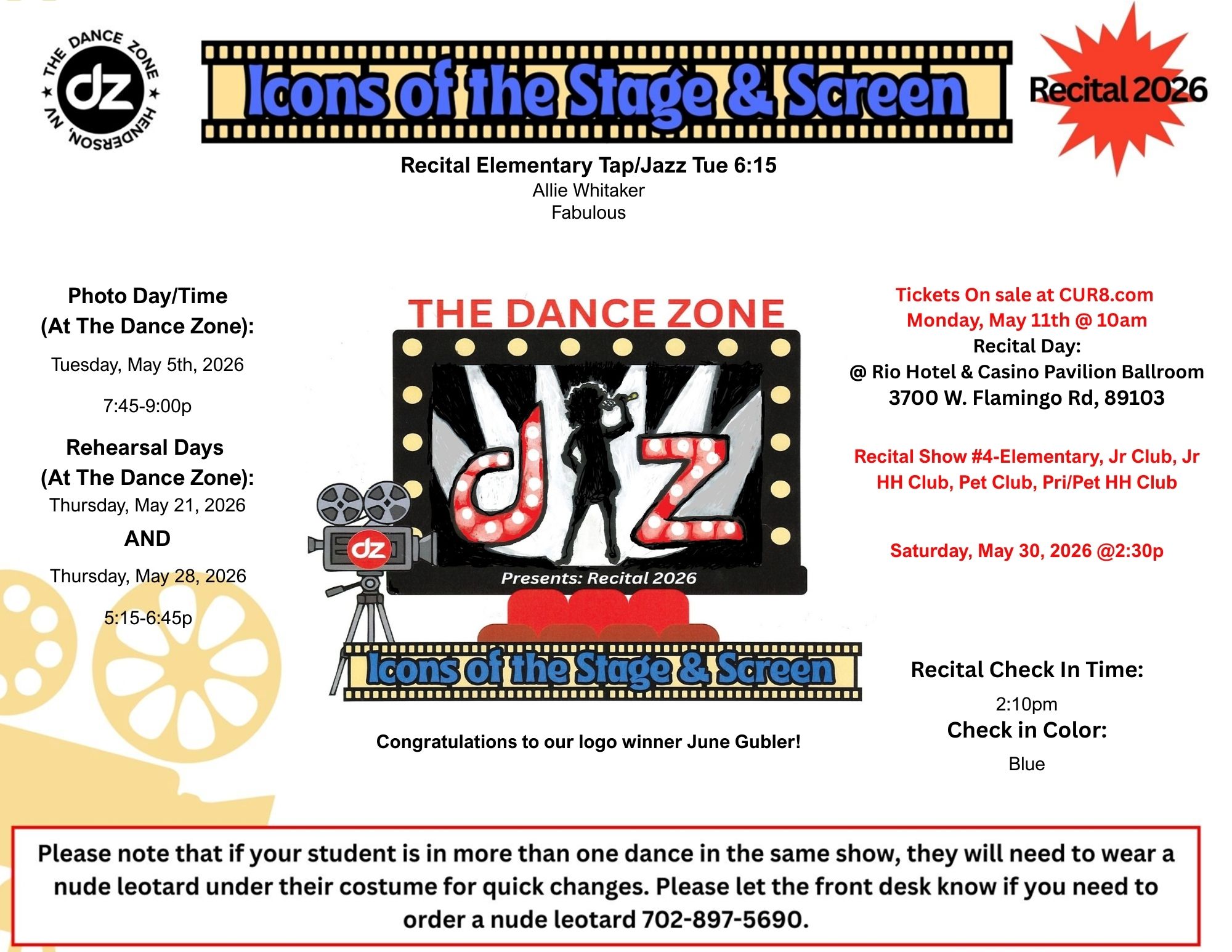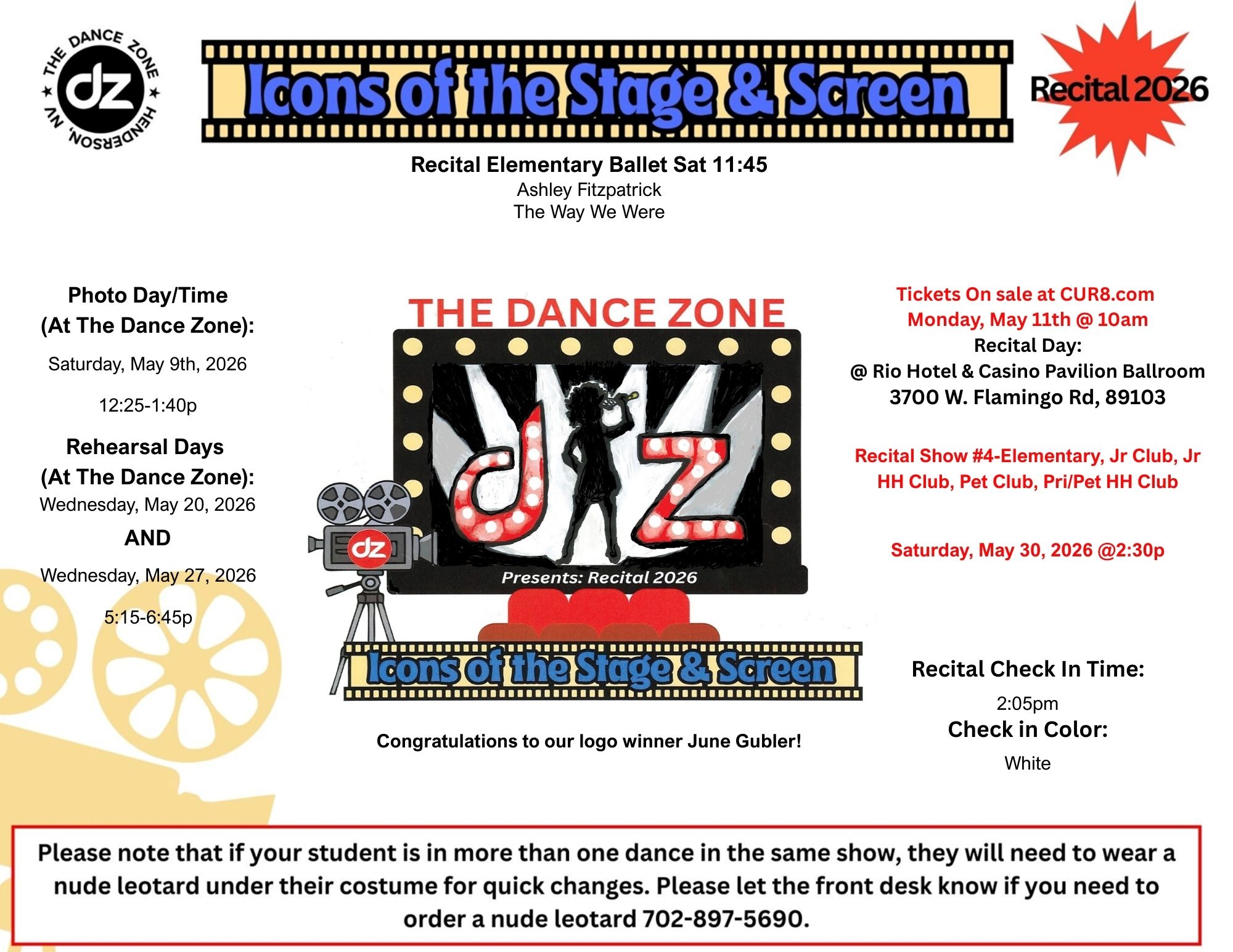 Show #4: Elementary Classes, Junior Club, Junior Hip Hop Club, Petite Club, Primary/Petite Hip Hop Club: Saturday, May 30th @ 2:30pm