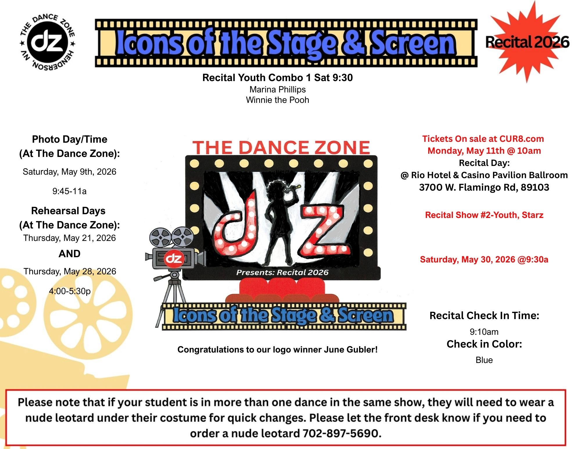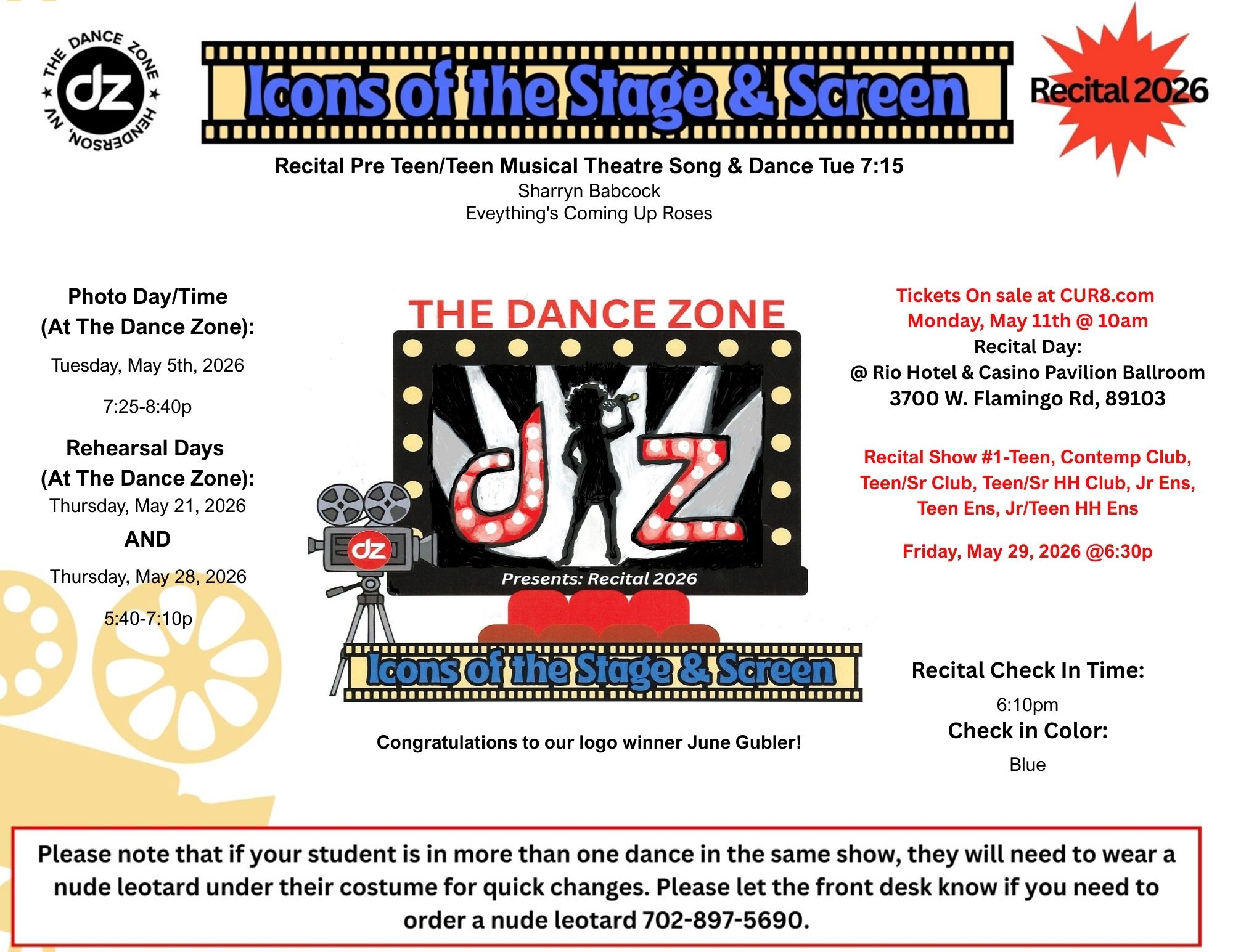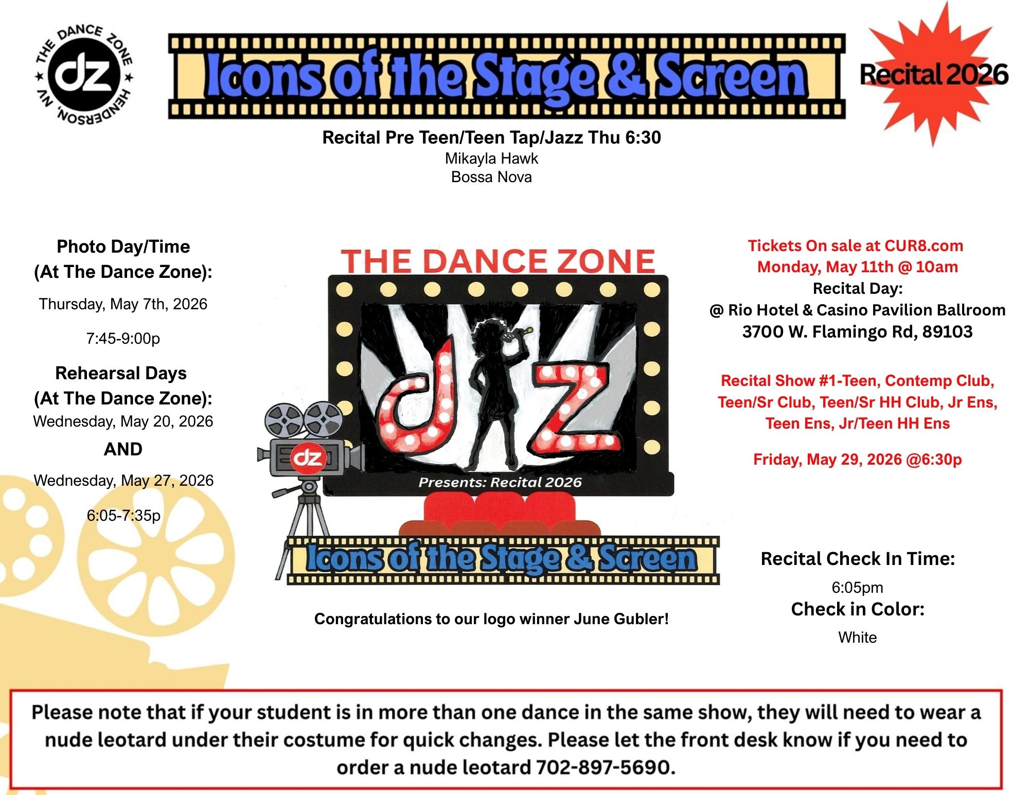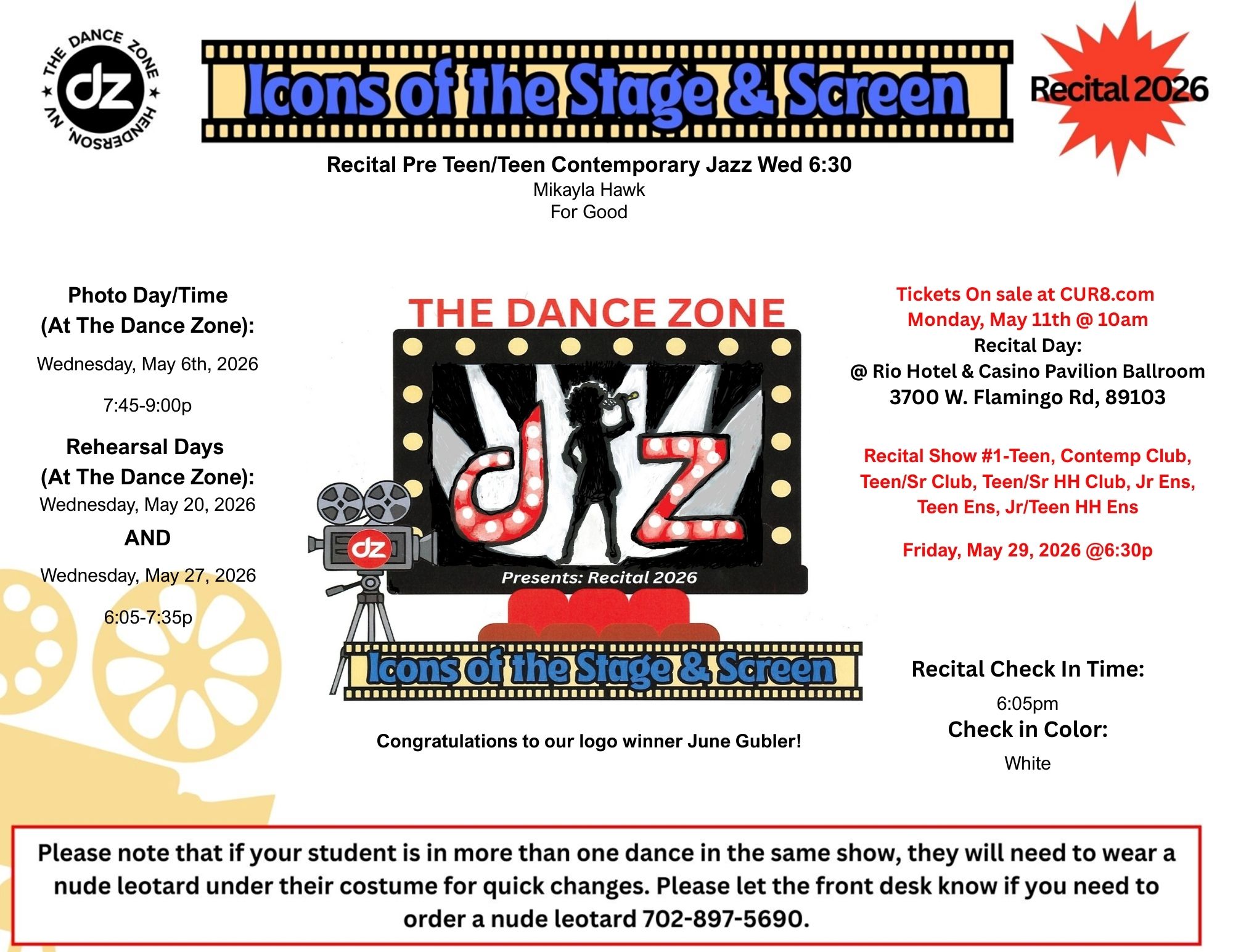 Show #1: Pre Teen/Teen Classes, Jr/Teen Contemporary Club, Teen/Sr Club, Teen/Sr Hip Hop Club, Junior Ensemble, Teen Ensemble, Jr/Teen Hip Hop Ensemble: Friday, May 29th @ 6:30pm